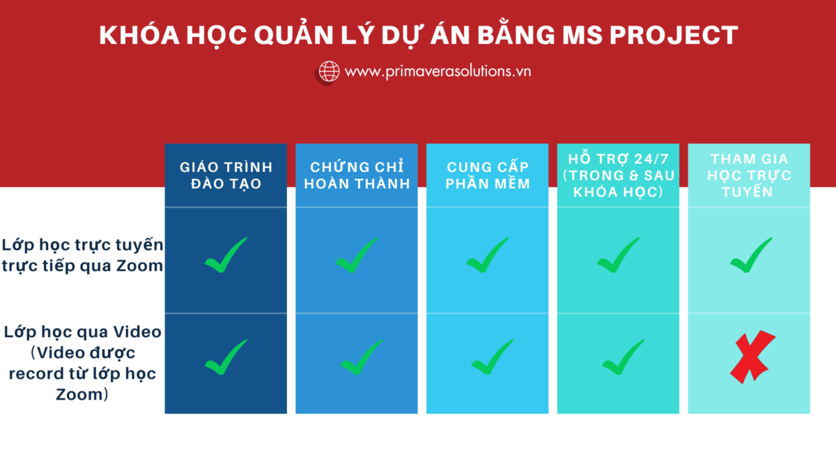 | 3 | Khóa học MS Project Basic | Trực tuyến trực tiếp qua Zoom (live training) | 05/01/2026 | 05 buổi | Tối thứ 2-4-6 (Từ 20:00 đến 22:00) | Tại đây |