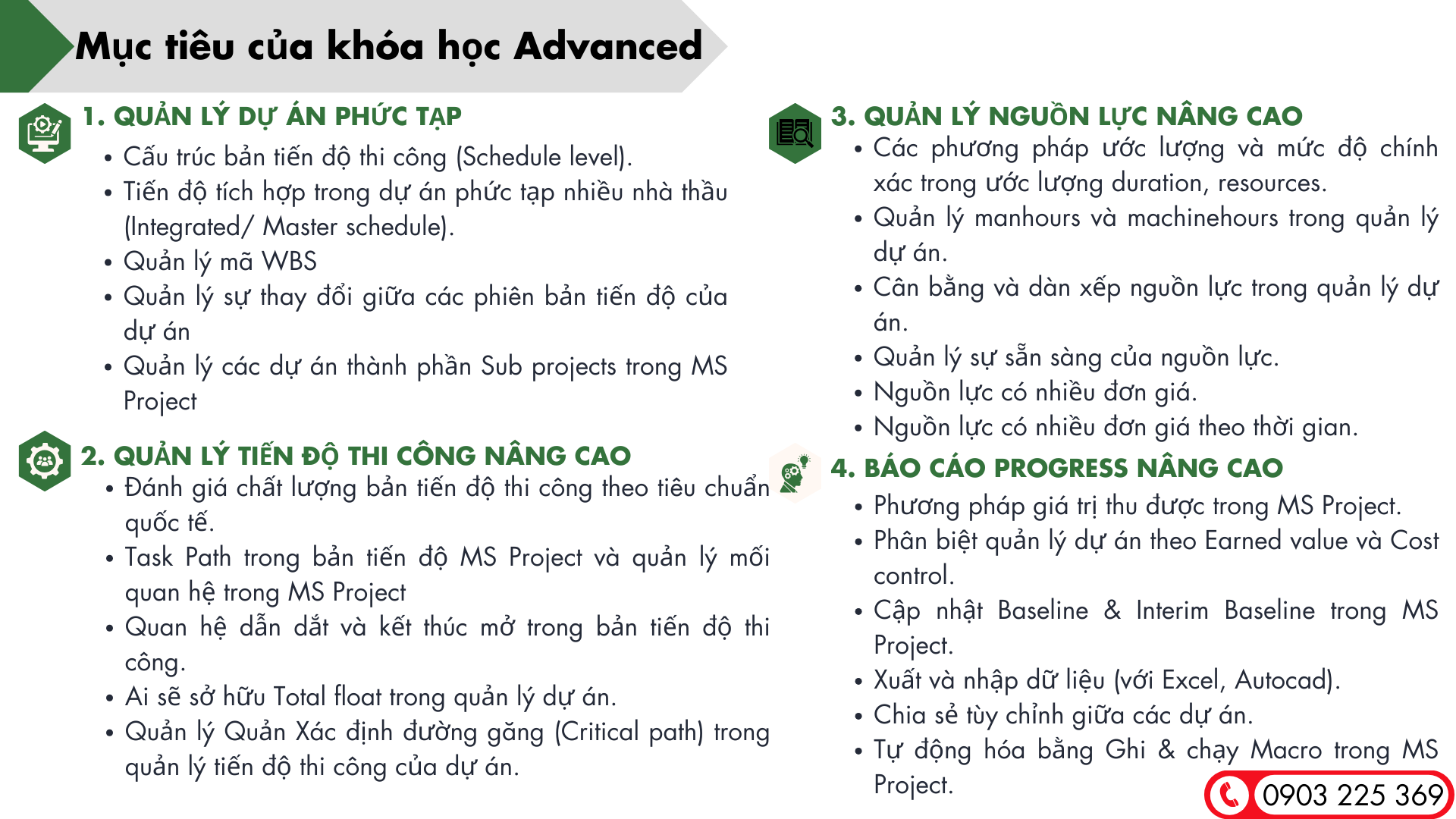 ☑️ Chủ đề 1: Cấu trúc bản tiến độ trong vòng đời dự án & Sub projects trong MS Project ☑️ Chủ đề 2: Quản lý Codes trong MS Project ☑️ Chủ đề 3: Các loại thời lượng công việc ☑️ Chủ đề 4: Các phương pháp ước lượng & Dự phòng tiến độ ☑️ Chủ đề 5: Split Task ☑️ Chủ đề 6: Recurring Task ☑️ Chủ đề 7: Task Path trong MS Project ☑️ Chủ đề 8: Open Ends/ Dangling Activities ☑️ Chủ đề 9: Quản lý Float ☑️ Chủ đề 10: Tự động hóa bằng Ghi và chạy Macro ☑️ Chủ đề 11: Đánh giá chất lượng bản tiến độ theo DCMA ☑️ Chủ đề 12: Hiệu chỉnh nguồn lực nâng cao ☑️ Chủ đề 13: Cân bằng & Dàn xếp nguồn lực ☑️ Chủ đề 14: Công cụ Compare Projects ☑️ Chủ đề 15: Cập nhật Baseline & Interim Plan trong MS Project ☑️ Chủ đề 16: Đồng bộ BOQ trong MS Project & Phương pháp giá trị thu được EVM ☑️ Chủ đề 17: Phần trăm hoàn thành thực tế ☑️ Chủ đề 18: Xuất và nhập dữ liệu ☑️ Chủ đề 19: Chia sẻ giữa các kế hoạch trong MS Project ☑️ Chủ đề 20: Quản lý rủi ro (Risk) trong MS Project